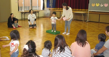自己紹介はみんなの前で、お母さんと一緒に名前と好きなものを