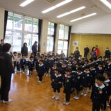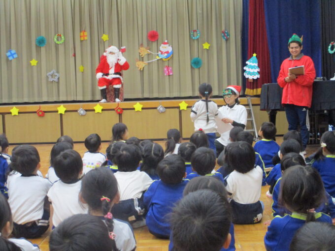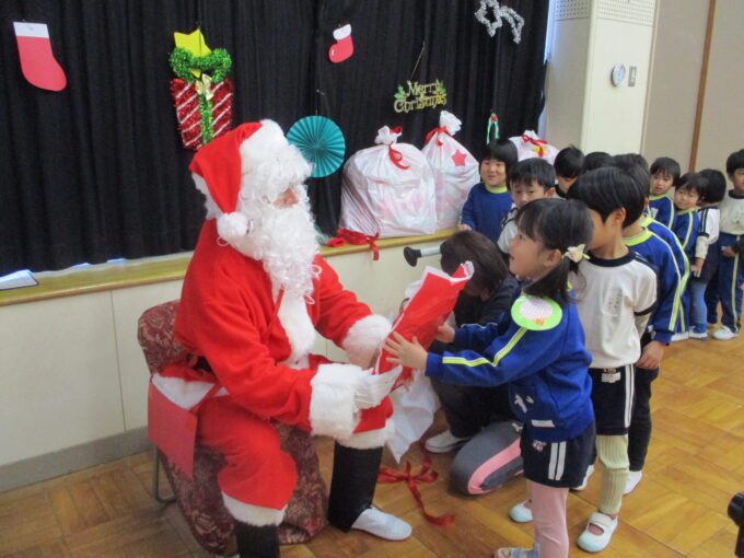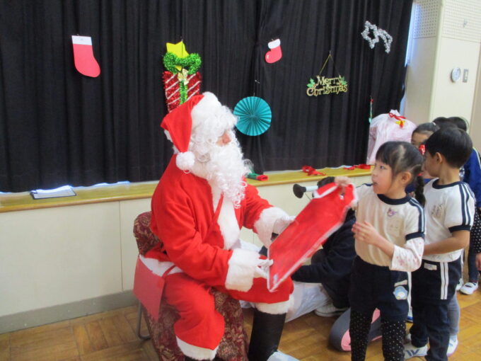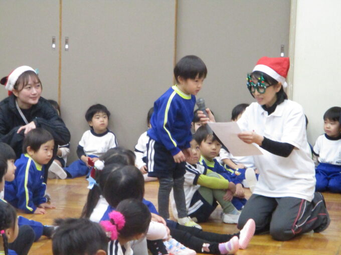 子ども達みんなが楽しみにしていたクリスマス会。おゆうぎ室にみんなで集まって、サンタさんを大きな声で呼びました。サンタさんの登場に、大喜びの子ども達。サンタさんに各クラスから質問もしました。
