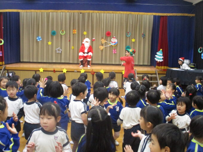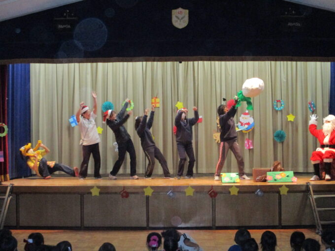 お腹のすいた、サンタさんにかぶをあげることに。先生たちが「おおきなかぶ」を育ててサンタさんにプレゼントしました。そして、みんなからはダンスをサンタさんに披露しました。