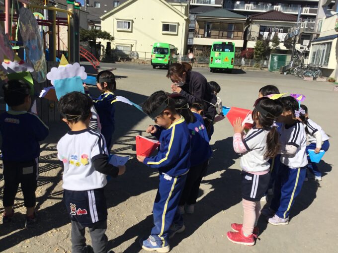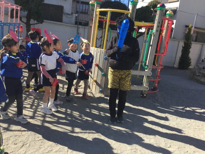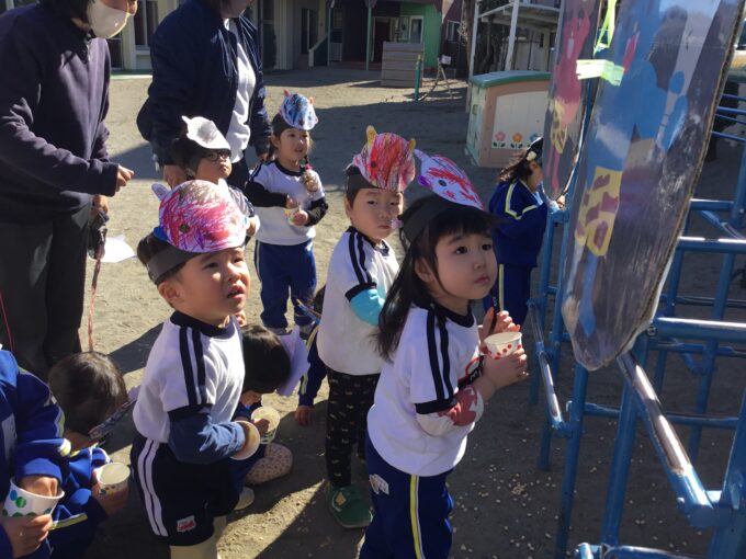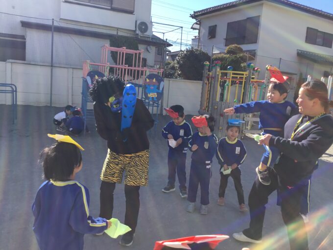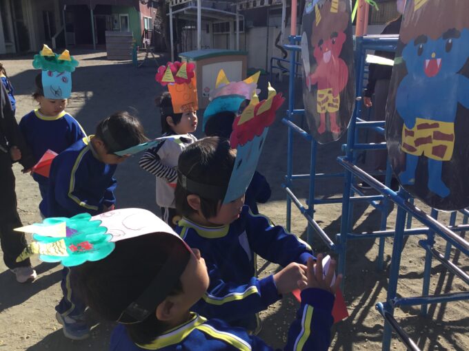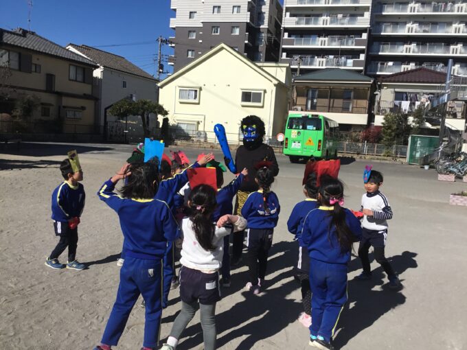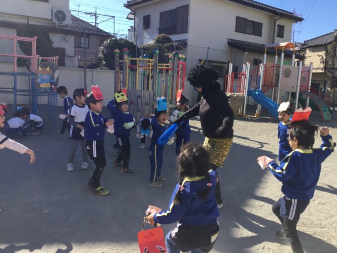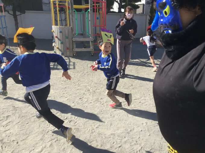 年長さん・年中さんは鬼が登場!職員室を見ても、見当たらない先生はいない。園長先生も一緒に豆まきをしている。「はて、この鬼は誰?」と年長さんのなかでは、鬼が誰なのか謎に包まれ、給食の時間も鬼の話でもちきりに。