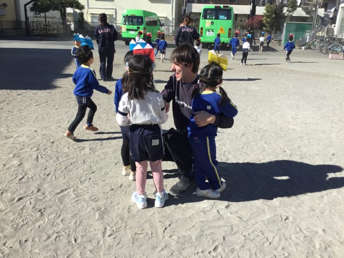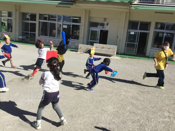 年中さんは鬼の怖さに、泣き出す子もいましたが、ルピー先生が安全基地になってくれて一安心。無事に鬼退治できました。