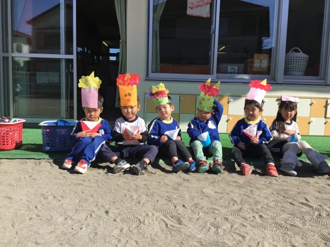今日は2月3日。角栄幼稚園でも、みんなの心の中の悪い鬼をおい出すために、豆まきをしました。自分で作ったお面をつけて三方に豆を入れたら準備OK!