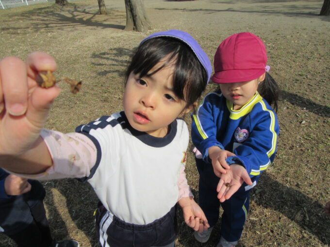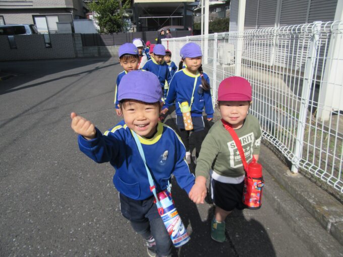 年中さんと満3歳児ほし組さんが東狭山ヶ丘公園にお出かけしました。年中さんがほし組さんの手をつなぎ、歩いて公園まで行きました。