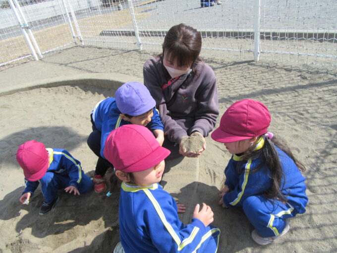 ブランコを順番に楽しんだり、砂場や木の下で宝探しをしたり。年中さんがお兄さんお姉さんとして、優しく声をかけ遊んでいました。