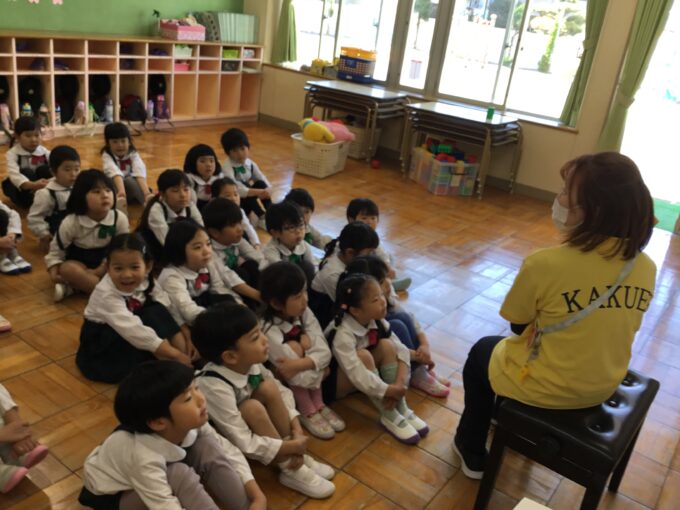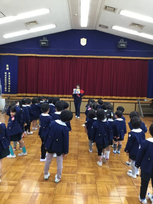 おゆうぎ室では、園長先生から「3つの約束」を聞き、先生の紹介をしてもらいました。