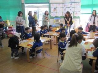 21日(火)は年少組の「動物村の広場」でした。広場で遊んでいる動物の子どもたちを、お母さんの所に戻してあげるという設定の分類操作を行う単元でした。一人ずつ発表も行いました。