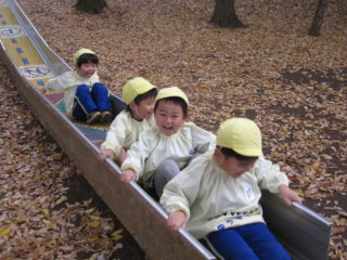 最初に遊具で遊び、次に公園を散策しました。いろいろな種類の落ち葉があることに気が付いたり、ドングリを拾ったりしました。最後は豪快に落ち葉遊び!11月の最終日、秋の自然をたっぷりと楽しみました。