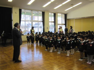 今日は2学期の終業式を行いました。園長先生から子どもたちへ2学期の成長や冬休みのお約束(①車に気をつけましょう。②お正月遊びを楽しみましょう。)についてのお話がありました。そして、楽しいこと、頑張ったことがいっぱいの2学期をみんなで振り返り、1人ひとりの自信につなげることができました。