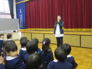 今日は平成29年度の修了式でした。年中さんと年少さんでおゆうぎ室に集まり、園長先生のお話を聞いたり、園歌を歌ったりしました。この一年間をみんなで振り返り、楽しかったことや頑張ったことなどをみんなで思い出しました。子どもたちはみんな、心も体も大きく育っています。