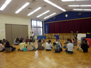 まずは、ヘザー先生と英語遊び。みんなでクレヨンカードで色を英語で言ってみた後は♪Rainbow♪を歌いました。大好きなお母さんの膝の上でゆったりとした流れの歌を歌ってほのぼのタイムでした。