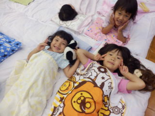 翌朝は、元気よく朝の体操をした後、フリスビー製作をしました。作ったもので最後は外に出てフリスビー大会。紙皿のフリスビーは遠くまで飛びました。お家の人と離れて過ごす2日間でしたが、友達同士楽しみそして助け合いが自然とでき、たくさんの経験ができました。このお泊り保育でまた一つ大きくなった年長さん。楽しいなつやすみを過ごして下さいね。保護者の皆様ご協力ありがとうございました。