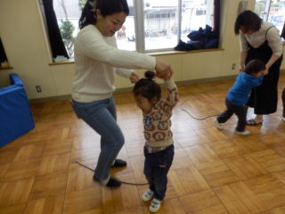 そして、最後の運動遊びは縄を使いました。ジャンプをしたり、ドライブをしたり、お家の人と綱引きもしました。