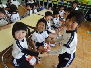 お部屋に年長さんがプレゼントを持ってやってきました。「なかよくしようね。よろしくね。」とプレゼントを渡し、握手でにっこり。