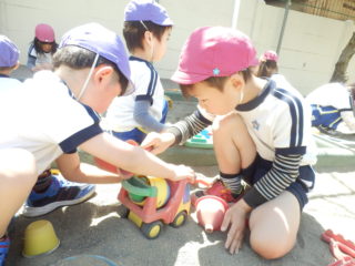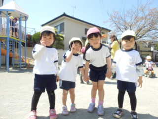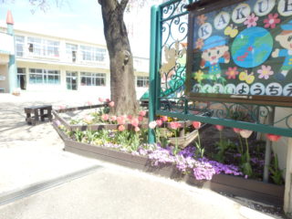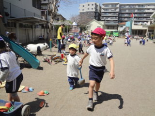 今日は、お天気も良かったのでそのままお外へでて年長さんと一緒に遊びました。おもちゃを貸してもらったり、一緒に走ったりと春の花がきれいに咲く園庭の中、ほんわかした気持ちで遊ぶことができました。