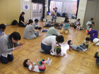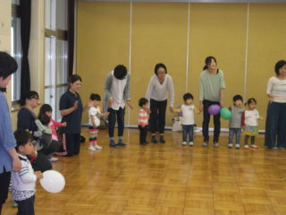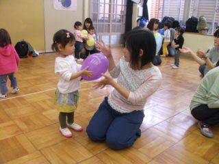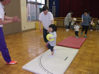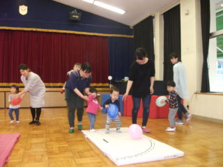 その後は風船遊び。お家の人とポンポンしたり、落とさないように走ったり、マットの上をジャンプしたりたくさん体を動かして遊びました。
