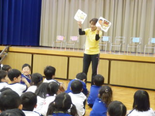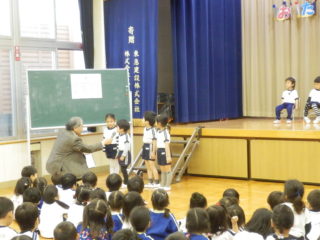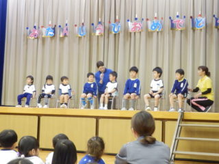 舞台の上でとても嬉しそうにしていた子ども達。プレゼントのお礼も上手に言えました。