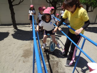 初めは恐そうにつかまっていた子も、少しずつ手を広げてバランスをとれるようになってきました。