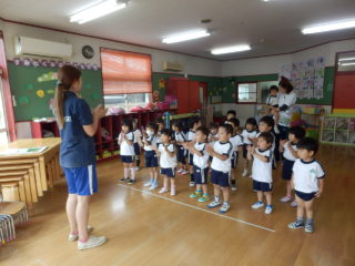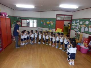 今日で5月もおしまいですね。10連休があったのであっという間に終わってしまった気がします。入園から2か月が経ち年少さんもお支度が上手になってきました。自分でできることも増え、「お着替え出来たよ!!」と自信を持って教えに来てくれる子もいます。そしてヘザー先生・ブランドン先生との英語、小山先生との体操も大好きな子どもたち。毎回楽しく行っています。