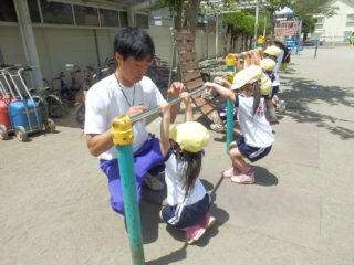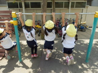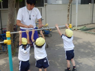 初めて戸外でも体操を行いました。この日は、鉄棒のぶらさがりに挑戦しました。初めは「できるかな、、、」と不安そうな表情をしていた子どもたちでしたが、小山先生にアドバイスをもらうと上手にぶら下がることができ、最後には笑顔で「またやりたい!」という子がたくさんいました。日々、様々な成長と表情を見せてくれる年少の子どもたち。これからもたくさんのことに挑戦していきたいと思います。