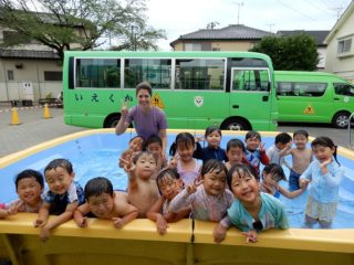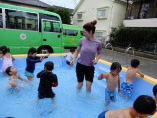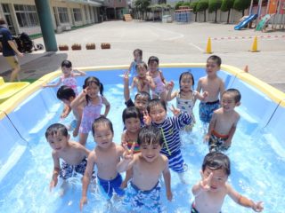 日に日に日差しも強くなり、「今日もプール入る?」と毎日水遊びも楽しみにしています。初めは体や顔など水がかかることにドキドキしていた子どもたちも少しずつ慣れ、今では水のかけっこも楽しめるようになりました。