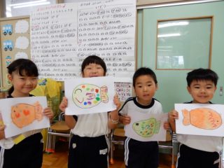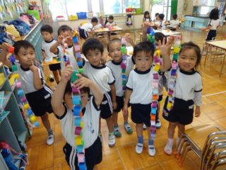 そして七夕や夕涼み会に向けて様々な製作も行ってきました。願い事を込めて短冊や笹飾りを作ったり、夕涼み会に飾るやぐら製作では色とりどりの魚を作りました。できた作品を嬉しそうに見せてくれました。