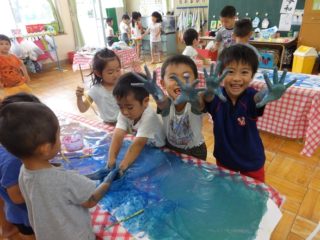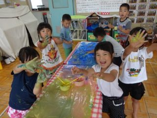 製作が終わると残った絵の具で遊びました。手で触る気持ち良さを感じたり、「黄色と青で緑になったよ」を色を混ぜて変化する様子も楽しんでいました。