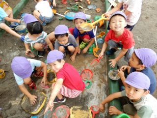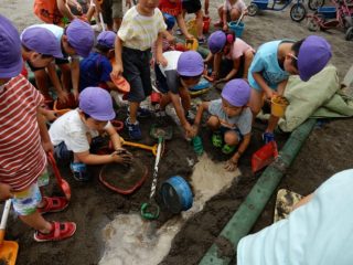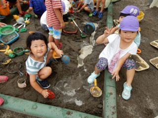 気温が低くてプールが入れない日は泥んこ遊びも楽しんでいます。砂場に道を掘って水を流すと、「わあ~、川ができたよ」と船を持ってきて浮かべたり、泥んこと白砂を使っておいしそうなお料理を作りおままごとをしたり、水や泥、砂の感触も喜んで遊んでいます。夏ならではの遊びも引き続き楽しんでいきたいと思います。