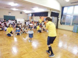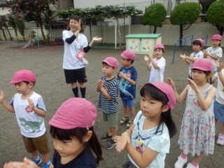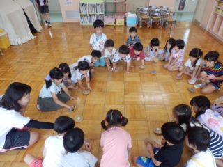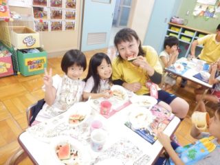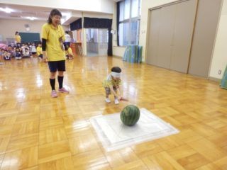 園に戻ってからは、スイカ割り大会。クラスのみんなで力を合わせて、見事に「パッカーン」と割れて歓声があがりました。