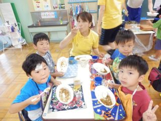 ご飯はみんなの大好きなカレー。さくら組さんももも組さんもカレーのお鍋は空っぽになりました。