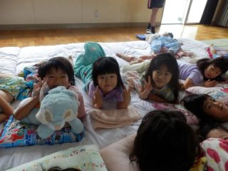 食後のお楽しみは、「フォーキーをさがせ!」みんなはトイストーリーのウッディとジェシーに変身して先生扮するフォーキーを探しに行きました。全てのお部屋を回ってポイントゲットでしました。そして、寝る前のお楽しみは花火。一日たくさん遊んで夜はぐっすり眠りました。