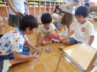 朝の目覚めもバッチリに、外で元気よく体操をしました。そして、おとまり保育最後のお楽しみは、こま製作。クレヨンで好きな模様を描いて、誰のが一番長く回るかみんなで勝負!あっと言う間にお帰りの時間になってしましたした。