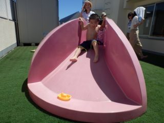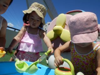 今日は、天気も良く気持ちよく遊びました。幼稚園での初めての水遊びにちょっぴりドキドキしている子もいましたが、じょうろでお水を流したり、ウォータースライダーを楽しみました。