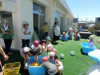 夏休み中ではありますが、親子未就園児教室「エンジェルクラブ」を行いました。おゆうぎ室に集まって、準備体操をしたら今日はおひさまくらぶのテラスにお邪魔して水遊び!今日は夏のお預かりで登園していたお兄さん・お姉さんも一緒でテラスはにぎやかでした。