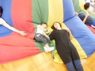 バルーンの上に寝転がったり、お布団にしてお母さんと一緒に入ったり、バルーンのお家に入ったり、ふわふわ・ほわほわの感触を味わいながら遊びました。