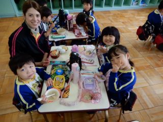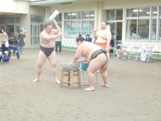 そして、お餅つき。おすもうさんやヘザー先生と一緒におもちをつました。おもちができるまでの見学もして出来上がりをまちました。