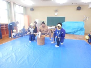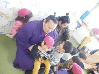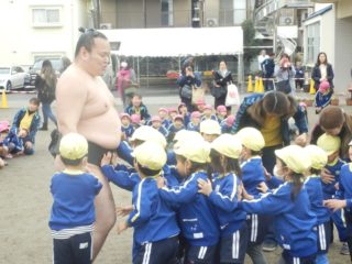 クラスごとに、お相撲さんとも対決しました。みんなで力いっぱいお相撲さんに立ち向かっていきました。年少さんは、お相撲さんのおなかに触れて柔らかい感触にニッコリしていました。
