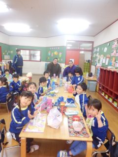 お礼に、子ども達からお相撲さんへプレゼント。今年は子ども達の似顔絵を描いた化粧まわしをプレゼントしました。