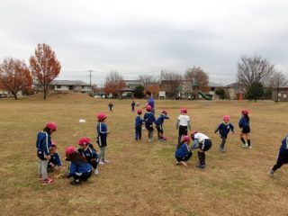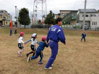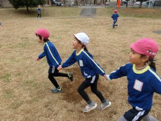 次にみんなで手つなぎ鬼をしました。1回戦は先生4人が鬼で、広い公園を逃げ回る子ども達を、なかなか捕まえることができませんでした。徐々に鬼の数を増やして3回戦行いました。横に長くなっても上手に走っていました。