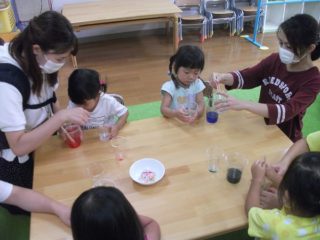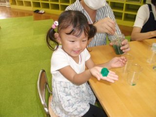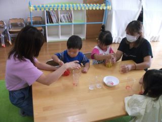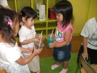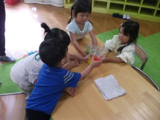 ブランドン先生と英語遊びをした後は,「ミックスジュース」の手遊びをしました。おいしいジュースで乾杯したけれどジュースがないので,お母さんと一緒に作ることにしました。スライムづくりです。洗濯のりに食紅で色をつけてぐるぐるかき混ぜます。
