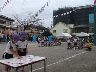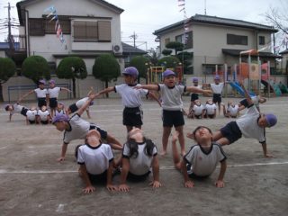 年長組は,最後の運動会。組体操や英語の先生との競技も友達と力を合わせて頑張りました。