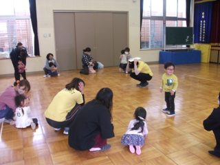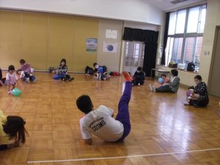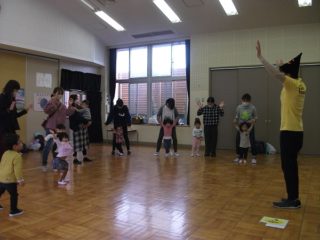 エンジェルクラブの日。ブランドン先生の英語は,ハロウィンダンスでスタートしました。お化けのゲームも捕まらないように頭を下げて繰り返し行って楽しみました。