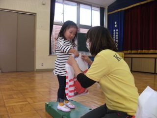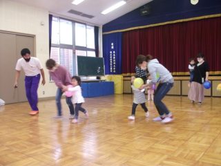 そして体操は,風船遊び。ジャンプしたり,風船を挟んで親子体操したり。かけっこは風船が落ちないように大好きなお家の人とぎゅっと手をつないで走りました。