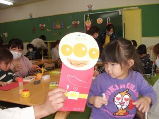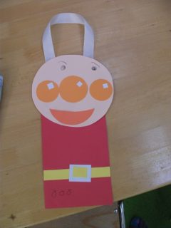 アンパンマンの手遊びをしてから,作りました。のりのつけ方は,「まわりのりと,ぐるぐるのり」「1のゆび」で上手にのりでぺったんしました。アンパンマンの目も上手に描けました。