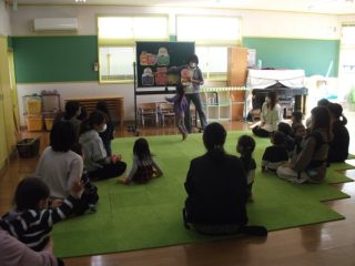 最後は,「アンパンマンのお友だちが持っているものはなぁんだ?」クイズ。カードに描いてある食べ物をみんなであてっこしました。