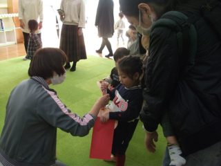 完成した千歳飴の袋に本物の千歳飴をお土産にもらうと,ニコニコの笑顔で「ありがとう」と嬉しそうに持ち帰りました。
