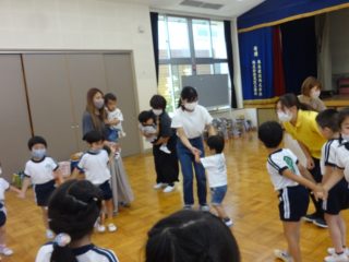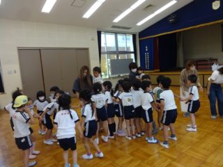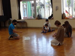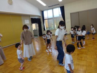 英語の後はさくら組の子どもたちと一緒に生活の歌を歌ったり、リトミックをして遊びました。おゆうぎ室で音楽に合わせてみんなでお散歩、ピアノの音に合わせて動いたり止まったり、雨が降ってきたり、虹が出たり、楽器や身体を使って「大きなたいこ・小さなたいこ」の大きさなど、いろいろな表現遊びを楽しみました。