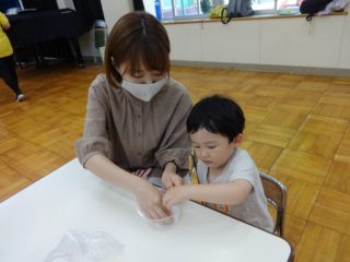 最後は感触遊び「片栗粉粘土」を作りました。ぎゅって丸めて固めたかと思ったら、あっという間に溶けてしまう不思議な感覚を楽しみました。