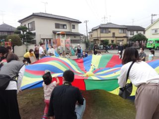 かけっこの後は,バルーン遊びをしました。ひらひらさせたり,お山登りをしたりバルーンの中に入って感覚遊びを楽しみました。