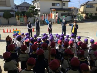 今日は,園庭で交通安全教室を行いました。交通指導員さんが信号の渡りかたや道路の歩き方を教えてくれました。