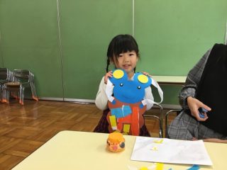 ねずみのみのむしさんを作りました。ねずみのお顔は,目にシールを貼ってクレヨンで口を描きました。耳もはって顔は完成です。みのむしの体は折り紙をびりびり破いて,好きな色のお洋服にしました。